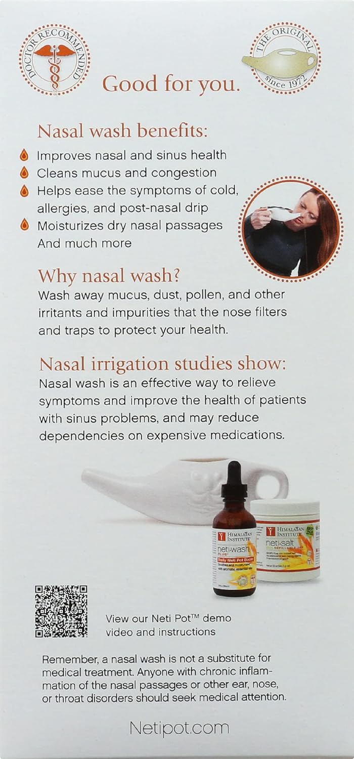 The Starter Kit contains everything needed for a daily nasal wash routine: Ceramic Neti Pot, Neti Pot Salt 10 ounce jar, and Neti Wash Plus 2 ounce bottle. The Himalayan Institute introduced the Neti Pot 35 years ago as the perfect tool to support sinus health. The Neti Pot naturally cleanses, refreshes, and protects the nasal passages. Starter kit includes: Ceramic Neti Pot- Our bestselling ceramic Neti Pot makes nasal irrigation easy and comfortable. The trademarked lotus design and distinctive shape dispenses the perfect rate of flow to optimally cleanse the sinus passages. Made with lead-free ceramic and glaze. Neti Pot Salt- Perfect for use with the nasal wash system, Neti Pot Salt is 99.99% USP grade salt, the highest purity salt commercially available. It is non-iodized and contains no additives or anti-caking agents. Use a heaping quarter teaspoon per Neti Pot use. 10 ounce refillable jar with measuring spoon. Neti Wash Plus Daily Neti Pot Boost- This formula contains soothing herbal extracts, essential oils, and Xylitol to cool, decongest, and invigorate. It helps to nourish and moisturize nasal passages and provides properties to support the health of your sinuses. Neti Wash Plus contains 5 herbal extracts, essential oils of Peppermint, Eucalyptus, and Menthol and other ingredients that mildly cleanse and soothe the sinuses.